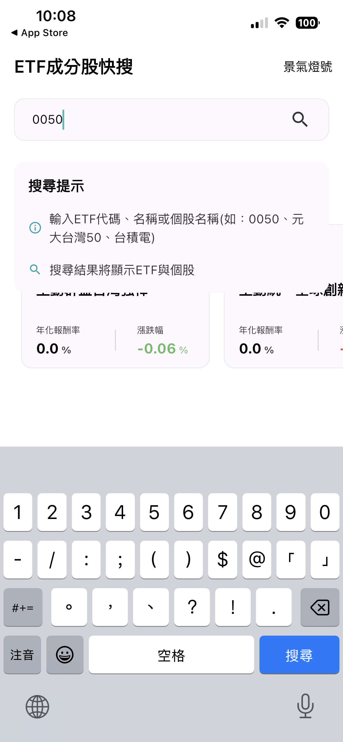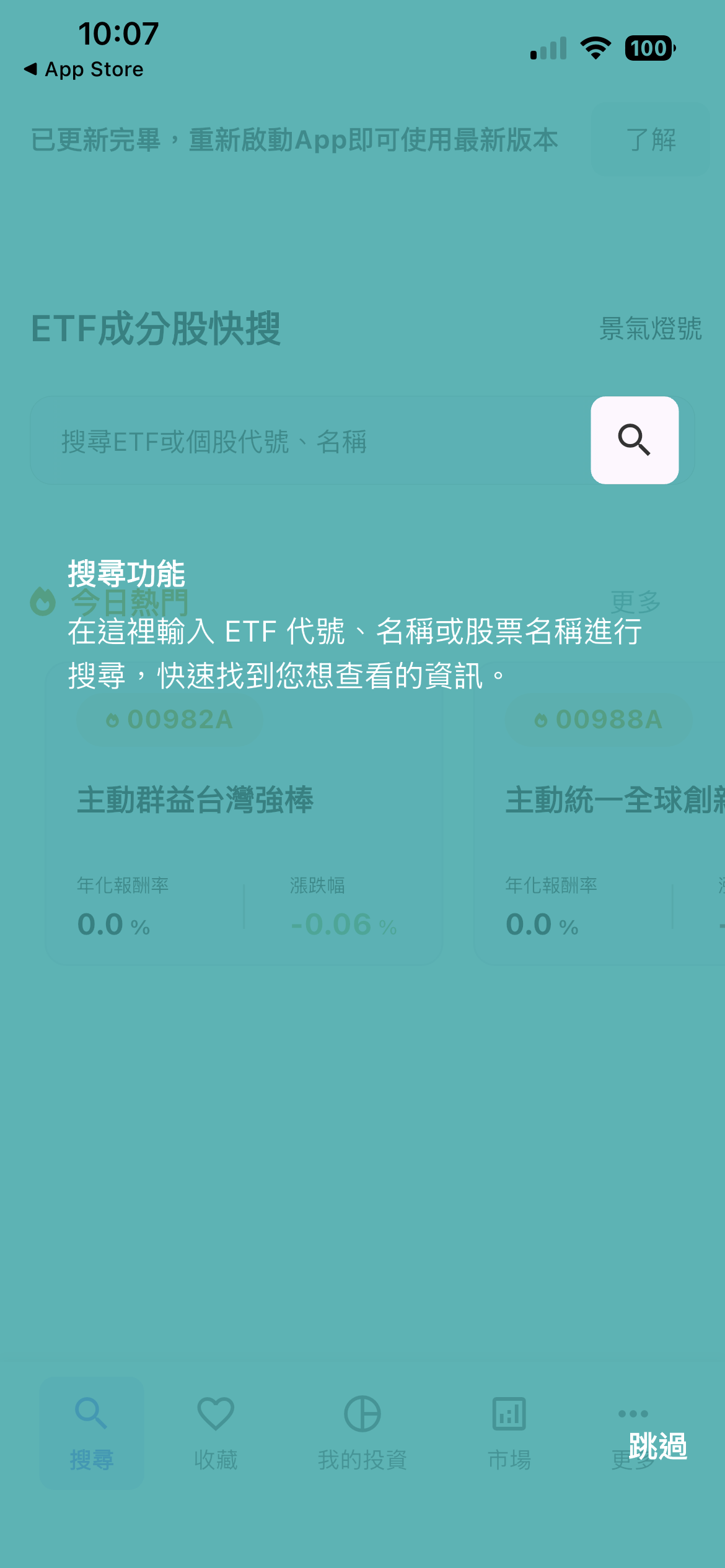 對於剛下載 App 的使用者來說,介面的簡潔度決定第一印象,「搜股的」提供新手智慧引導系統:初次啟動時,App 會透過亮點提示,教導使用者如何操作「搜尋功能」,讓你能輸入 ETF 代號、名稱,甚至直接搜尋個股名稱(如:台積電),找出它被哪些 ETF 所持有。下面股感以 0050 的搜索為例 :