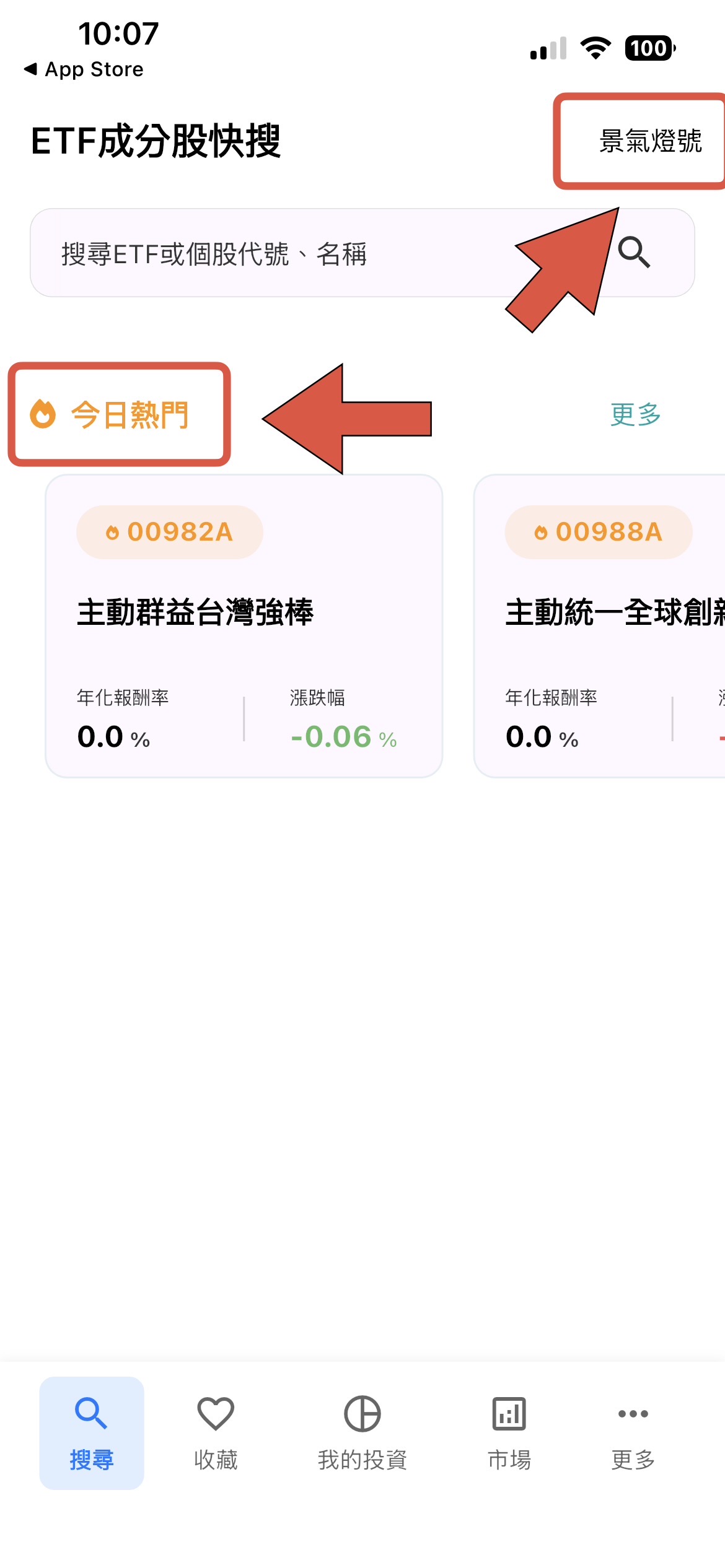 - 今日熱門標的:首頁自動推播當前市場最具話題性的投資標的,並顯示關鍵的「年化報酬率」與「漲跌幅」,幫助投資者在開盤前就掌握熱門資金的流向。