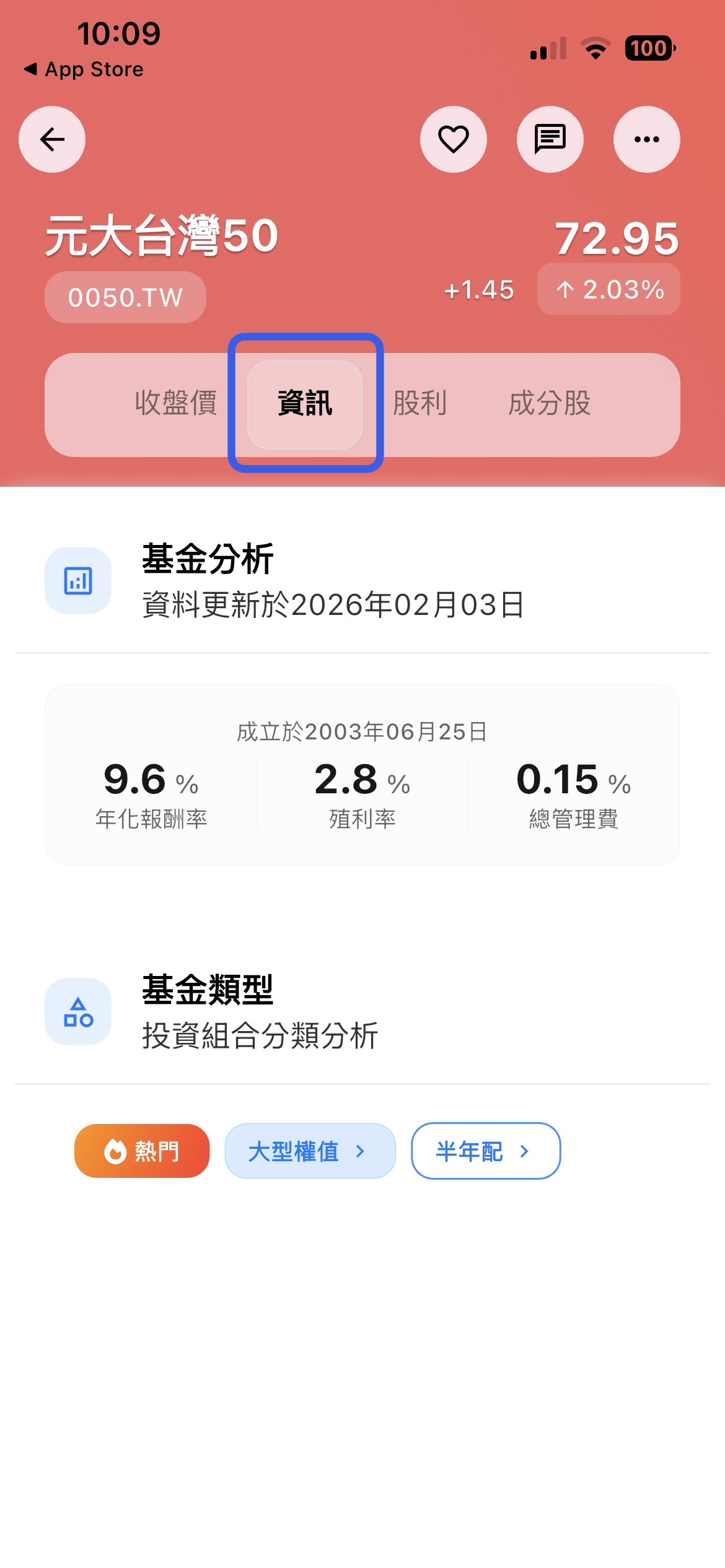 - 智慧標籤:系統會賦予 ETF 標籤,如「大型權值」、「半年配」、「熱門」等,讓你一眼看出這檔基金的個性。也可以再點入觀察更多有一樣標籤的標的