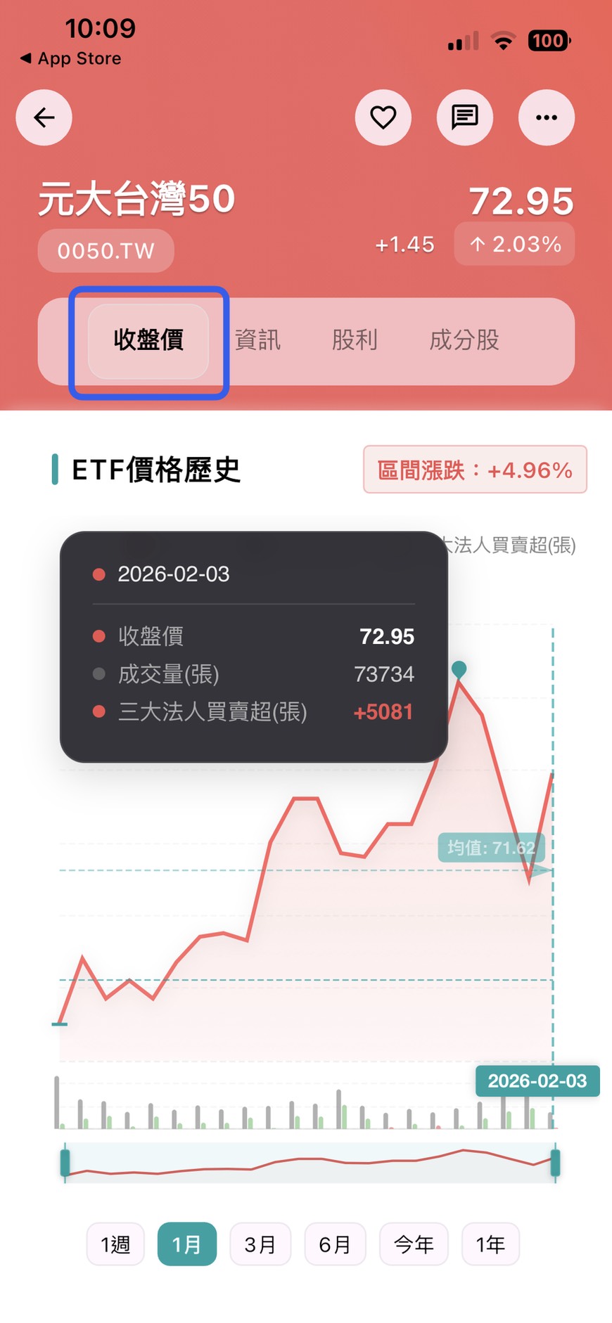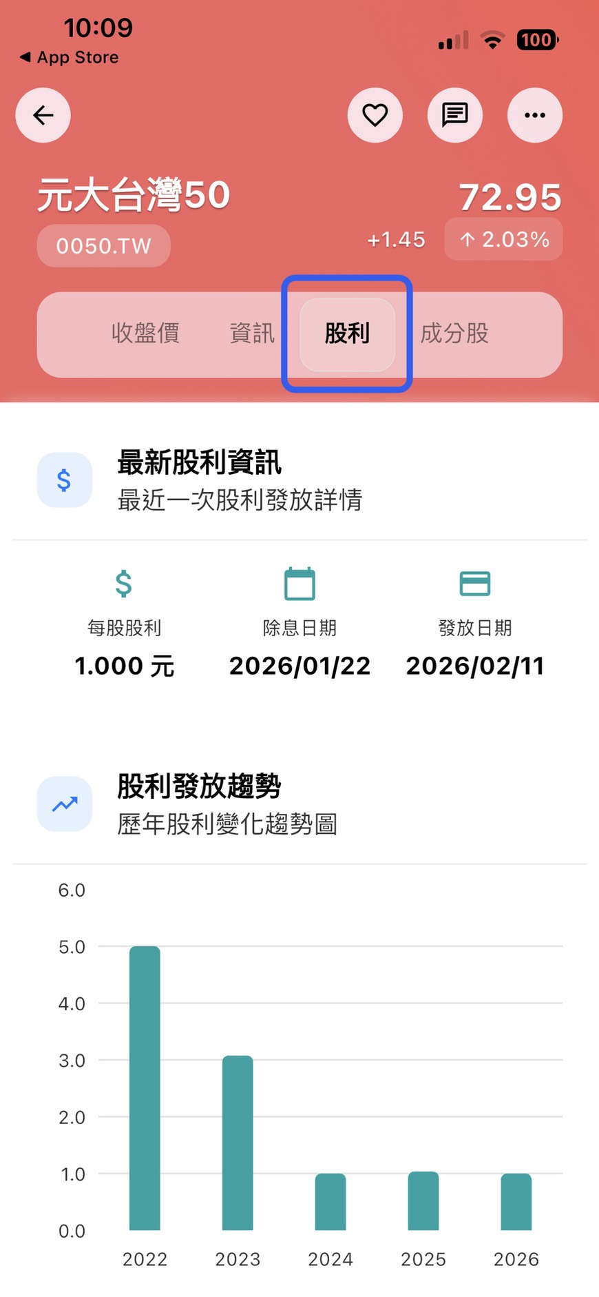「配息」是許多存股族看重的重點。App 的「股利」分頁不僅顯示了最新的除息日、發放日與每股金額,更提供歷年股利發放趨勢圖。透過長期的配息數據對比,你可以判斷該 ETF 是否具備長期穩定的分紅能力,而非短期噱頭。