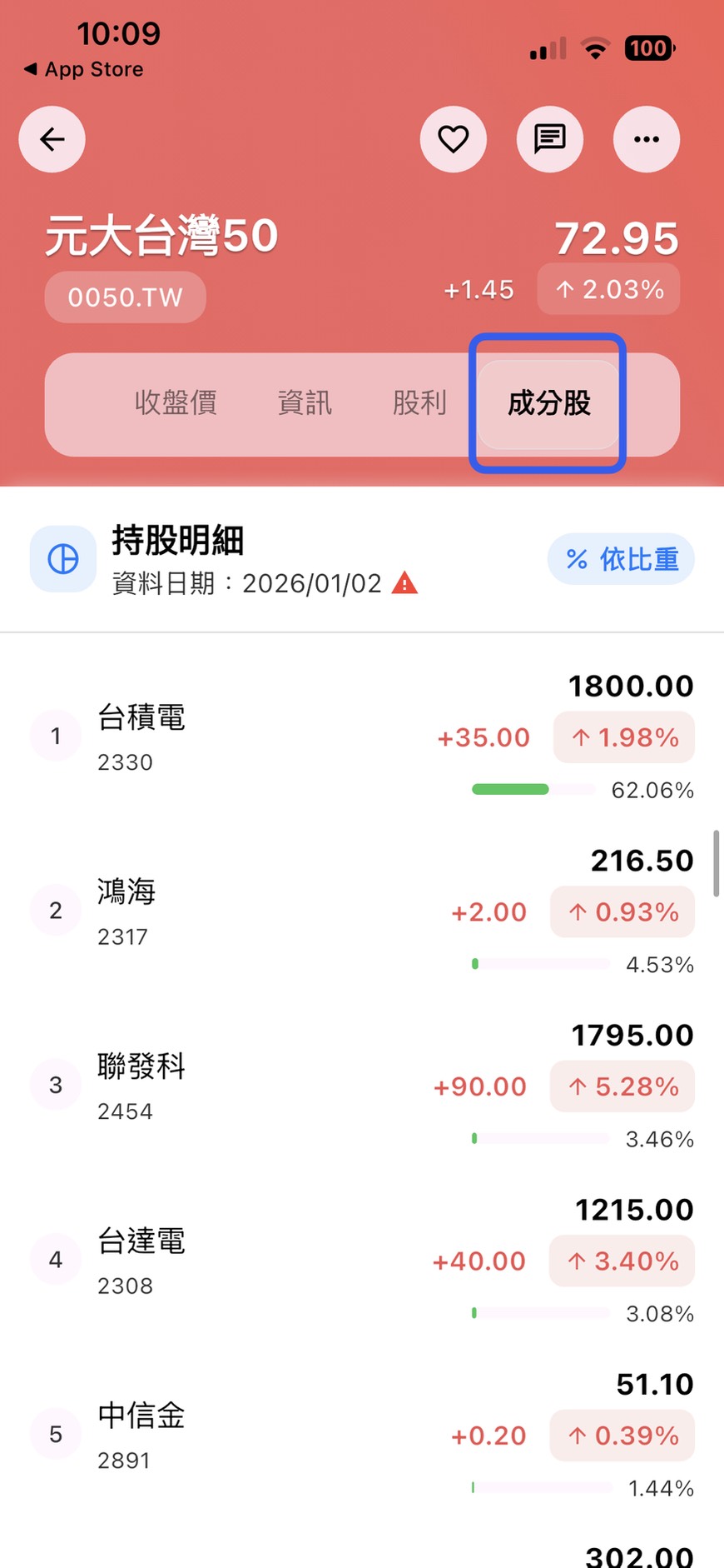 「成分股」分頁會詳列所有持股。使用者可以選擇「依持股比重」排序,精確掌握哪幾間公司主掌這檔 ETF 的表現。這對於想避開特定產業或想分散風險的投資者來說,是非常有價值的數據。